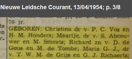 Beroep in 1954: kantoorbediende bij Van Gend en Loos in de Breestraat Woonde in Leiden aanvankelijk op de Hoge Morsweg 52, daarna is hij verhuisd naar de Goejéstraat 9. In 1956 is de hele familie geemigreerd naar Rochester, USA. Dit blijkt o.a. uit een overlijdensadvertentie uit 1963 van de moeder van Margaretha de Tombe, waarin dit als woonplaats is genoemd. |